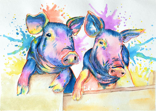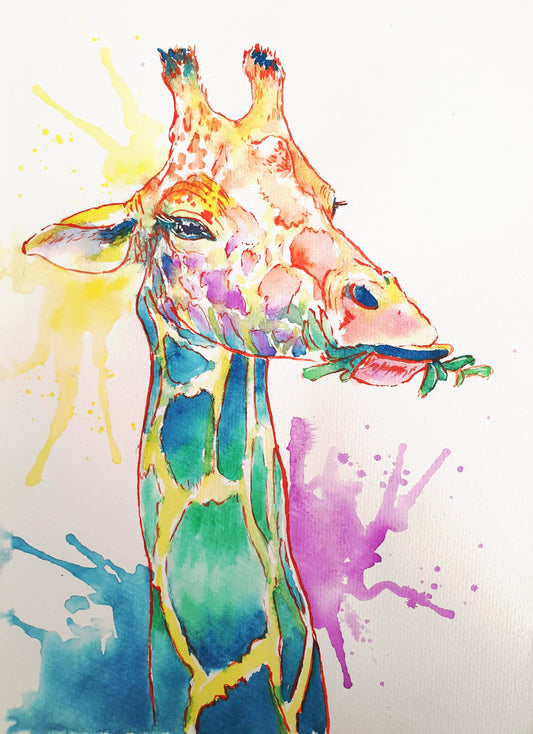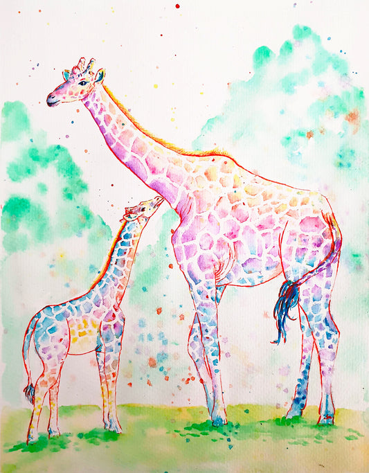 Watercolour A4 Print - Rainbow Giraffe and Calf